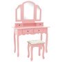 Nuestro encantador juego de tocador y taburete está hecho de madera de paulownia de alta calidad. Su estilo victoriano y su acabado gris limpio están diseñados para aportar elegancia y belleza al tocador, salón personal o vestidor. La exquisita mano de obra es una característica sobresaliente de este juego de mesa y taburete. Esta mesa de maquillaje cuenta con un espejo de mesa 3 en 1, 2 espejos laterales plegables con bisagras duraderos. También puedes girarlos al ángulo deseado. Sorprendentemente, la estructura del espejo y la mesa se pueden utilizar por separado. Además, los 4 cajones elegantes ofrecen espacio adicional para adornos, cosméticos y otros elementos esenciales. Este juego de mesa y taburete de cosmética es sin duda un punto de atracción, donde sea que se coloque.