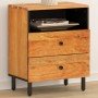 Esta mesita de noche, con un diseño elegante, es un aporte atemporal para la decoración de tu hogar. Madera maciza de mango: La madera maciza de mango es una madera dura, tropical y resistente, que sirve para fabricar muebles robustos. Las bonitas vetas de la madera hacen que cada mueble sea ligeramente diferente al resto. Hecho de madera maciza de mango, el mueble es duradero y estable.Amplio espacio de almacenaje: La mesita de noche está diseñada con 2 cajones y 1 compartimento para guardar las cosas organizadas y al alcance.Superficie estable: La superficie de este mueble auxiliar es perfecta para exponer objetos decorativos, marcos de fotos y plantas.Patas resistentes: Las patas de hierro aumentan la robustez y estabilidad de los muebles del dormitorio. Advertencia:Para evitar que vuelque, este producto debe usarse con el dispositivo de fijación a la pared suministrado.
