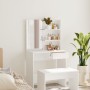 Con unas líneas rectas y elegantes y una forma asimétrica repleta de originalidad, ¡este tocador atraerá todas las miradas, sin duda! Material estable: La madera contrachapada tiene una calidad excepcional, con una superficie lisa y también cuenta con fuerza, estabilidad y resistencia a la humedad.Espejo de tocador: La mesa tocador con espejo es perfecta para tu rutina diaria de belleza. ¡El espejo te permite cuidar la piel y maquillarte!Amplio espacio de almacenaje: La superficie del tocador, los dos estantes sobre la mesa y el cajón de debajo proporcionan un espacio amplio para acceder fácilmente al maquillaje, las joyas y tus básicos del día a día.Diseño moderno: El moderno diseño posee líneas limpias y aspectos minimalistas como parte del estilo de interiorismo. Advertencia:Para evitar el vuelco, este producto debe usarse con el dispositivo provisto para fijarlo a la pared. Nota:Cada producto viene con un manual de montaje en la caja para facilitar el montaje.