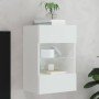 Este mueble de pared para TV es la solución perfecta para la casa, con el fin de maximizar el espacio y mantener el suelo despejado. Material duradero: La madera contrachapada tiene una calidad excepcional, con una superficie lisa y también cuenta con fuerza, estabilidad y resistencia a la humedad.Luces LED RGB: El mueble multimedia de pared está equipado con increíbles luces LED RGB. Con diversos menús personalizables, puedes cambiar el color de las luces sin esfuerzo e incluso hacer que se ajusten automáticamente. Estas luces LED no sólo realzan el aspecto moderno del mueble de TV flotante, sino que también le dan un toque a la moda.Amplio espacio de almacenaje: El mueble para TV de pared tiene 2 estantes de vidrio y 4 compartimentos detrás de las puertas que ofrecen un amplio espacio para mantener organizadas y al alcance objetos pequeños, como libros, DVD y revistas.Versátil: El mueble es multiusos y puede utilizarse como mueble de pared para TV o como mesita de noche de pared. También puedes combinarlo con otros armarios para crear una impresionante pared en el salón.Diseño de pared: El armario con LED se puede montar en la pared para ganar un plus de espacio de almacenaje. De este modo, podrás aprovechar al máximo el espacio del suelo y mantener la zona limpia. Información útil:Los tornillos y los tacos para el interior de la pared no están incluidos. Recomendamos encontrar y utilizar tornillos y tacos adecuados específicamente para las paredes. Si no estás seguro, puedes consultar con un profesional. Lee y sigue cada paso de las instrucciones.El producto tiene un conector USB que necesita una fuente de alimentación USB certificada de 5 V (no incluida).
