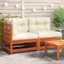 Este sofá de jardín de madera con cojines y reposapiés será un fantástico complemento para tu jardín, terraza o patio para charlar con familiares y amigos o simplemente disfrutar del buen tiempo. Madera maciza de pino: La madera maciza de pino es un bonito material natural. La madera de pino tiene vetas rectas y los nudos dan al material su característico aspecto rústico. Hecho de madera maciza de pino, este sofá sin reposabrazos es duradero y estable.Asiento cómodo: El respaldo y los cojines acolchados gruesos hacen que los asientos de jardín resulten más cómodos.Uso versátil: Este taburete de exterior no solo se puede usar para sentarse o descansar los pies, sino que también se puede utilizar como mesa de centro para colocar bebidas, comida y adornos.Diseño de listones: El diseño de listones del sofá de exterior evita que el agua se acumule de forma eficaz, para que el asiento permanezca seco y no se pudra.Diseño modular: Este sofá de patio tiene un diseño modular, por lo que es completamente flexible y fácil de mover para adaptarse a cualquier entorno. ¡Puedes combinarlo con otros segmentos modulares disponibles en el menú desplegable para crear tus propias configuraciones de muebles de jardín! Información útil:Para asegurarte de que tus muebles de exterior se mantengan hermosos, recomendamos protegerlos con una funda impermeable.