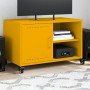 Este mueble para TV es sencillo y práctico, y se adapta perfectamente a tu salón. Material duradero: El acero es un material muy duro y fuerte. Ofrece robustez y estabilidad. Las placas de acero laminadas en frío tienen una buena calidad superficial y una alta precisión dimensional.Función expositora: La resistente superficie del mueble es ideal para exhibir objetos decorativos como marcos y plantas.Amplio almacenaje: El mueble de TV ofrece una puerta y 2 estantes que lo convierten en un lugar ideal para guardar todas las revistas, DVD y otros objetos.Fácil mantenimiento: La mesa de centro con superficie resistente a las manchas es fácil de limpiar y puedes mantener la mesa con el mejor aspecto sin esfuerzo.Fácil de mover: Este armario tiene 4 ruedas, lo que hace que se mueva con flexibilidad y se estacione de manera estable en cualquier momento.