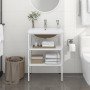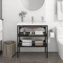 Esta estructura de lavabo de baño con seno integrado es la combinación perfecta para tu baño o lavabo con un aspecto limpio y ordenado. El soporte de lavado está hecho de hierro con recubrimiento en polvo, lo que lo hace estable y duradero. Este soporte de lavabo facilita el acceso a las toallas y cestas y crea un espacio más amplio que el almacenamiento cerrado. Hecho de cerámica, el lavabo no sólo puede servir como recipiente de uso diario, sino también como adorno en tu hogar. Gracias a su diseño vanguardista y moderno, este lavabo se adaptará sin duda a cualquier decoración. También está equipado con un agujero de desbordamiento para que fluya el agua cuando se llena demasiado. Su superficie acristalada aporta un diseño moderno y elegante a la vez. Además, la estructura y el lavabo son fáciles de limpiar con un paño húmedo. Nota: El grifo y el desagüe no están incluidos en la entrega.