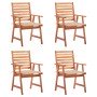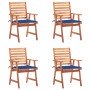 Este moderno juego de sillas de comedor de madera con cojines dará un toque de estilo natural a tu jardín, terraza o patio. Este juego de sillas de madera será una gran opción para cenar al aire libre. Estas sillas de jardín están hechas de madera maciza de acacia, una madera dura tropical, que es resistente a la intemperie y duradera para años de uso. La superficie con acabado de aceite es fácil de limpiar con un paño húmedo. El diseño de listones aportará un encanto rústico. Además, los cojines incluidos brindan mayor comodidad al sentarse. Está confeccionado en 100% poliéster que ha sido tratado para hacerlo impermeable. Cada cojín tiene dos juegos de cuerdas para fijarlo firmemente a la silla. Nota: Para prolongar la vida útil de los muebles de exterior, te recomendamos que los limpies con regularidad y no los dejes al aire libre sin protección innecesariamente.Limpieza: Usa una solución de jabón suaveAlmacenamiento: Si es posible, guarda el producto en un lugar fresco y seco en el interior. Si el producto se almacena al aire libre, protégelo con una funda impermeable. Limpia y seca el exceso de agua o nieve de las superficies planas después de una lluvia o nevada. Permite la ventilación para evitar daños relacionados con la humedad.