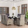 ¡Este juego de comedor para jardín es una excelente opción para cenar o relajarse en el espacio al aire libre de tu casa! Las estructuras de acero con recubrimiento en polvo hacen que la mesa y las sillas sean robustas y estables para usar a diario en exteriores. Gracias al ratán PE resistente al agua, las sillas reclinables son a prueba de oxidación, lo que puede proporcionar años de relajación de calidad. La superficie lisa de vidrio es fácil de limpiar con un paño húmedo y es perfecta para colocar comidas, bebidas y otros artículos decorativos. Nota: Para prolongar la vida de tus muebles de exterior, te recomendamos que los protejas con una funda impermeable.