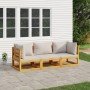 ¡Disfruta de una taza de café o té con un tiempo agradable en el espacio al aire libre de la casa con este elegante juego de muebles de jardín de madera! Madera maciza de acacia: Este juego de muebles de jardín está hecho de madera maciza de acacia. La madera maciza de acacia es un bonito material natural. La madera de acacia es una madera dura tropical, densa, robusta y duradera.Cómodo asiento: El respaldo añade un plus de comodidad al sofá. Además, los cojines gruesos y acolchados proporcionan comodidad al asiento.Mesa práctica: La mesa resistente es perfecta para colocar comidas, bebidas y otros artículos decorativos.Diseño modular: El juego de sofás de jardín es flexible y fácil de mover, por lo que puedes combinarlo con otros segmentos modulares de la tienda web para crear tus propias configuraciones personales de juegos de muebles para jardín. Información útil:Para facilitar al máximo el montaje, cada producto se entrega con un manual. Nota:Para asegurarte de que tus muebles de exterior se mantengan hermosos, recomendamos protegerlos con una funda impermeable.