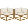 Disfruta de tus momentos de ocio dentro o fuera de casa con este elegante conjunto de sofás de madera, compuesto por un sofá esquinero y un sofá intermedio.Madera maciza de acacia: Este juego de salónes de madera maciza de acacia. La madera maciza de acacia es un bonito material natural. La madera de acacia es una madera dura tropical, densa, resistente y duradera. Su acabado al aceite hace que el sofá sea apto para el uso al aire libre.Cómodo asiento: El respaldo añade un plus de comodidad al sofá. Además, los cojines gruesos y acolchados proporcionan comodidad al asiento.Diseño modular: El juego de sofás de exterior es flexible y fácil de mover, por lo que puedes combinarlo con otros segmentos modulares de la tienda web para crear tus propias configuraciones personales de juegos de muebles para jardín. Nota:Para asegurarte de que tus muebles de exterior se mantengan hermosos, recomendamos protegerlos con una funda impermeable.