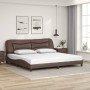 ¡Consigue un sueño más reparador con esta estructura de cama con cabecero! Es un aporte acogedor para cualquier dormitorio. Material duradero: El cuero sintético de primera calidad es un material muy duradero. Es resistente a las manchas, por lo que es fácil de limpiar con un paño húmedo. Además, la superficie lisa da un aspecto lujoso y la belleza del cuero auténtico.Listones robustos: Los listones de madera contrachapada proporcionan una buena distribución del peso, lo que garantiza que el colchón se mantenga en tu sitio con cada giro y vuelta del cuerpo mientras duermes.Excelente soporte: El cabecero acolchado está relleno de fibra PP para una comodidad ultrasuave y óptima, lo que te brinda un excelente soporte para la espalda mientras estás sentado en la cama para leer o ver la televisión.Diseño lateral ondulado: El look ondulado de la estructura de la cama es elegante y sofisticado, agregando un toque moderno y elegante a tu decoración, convirtiéndolo en el foco de atención de tu dormitorio. Información útil:El colchón no está incluido con la cama. Disponemos de una variada selección de colchones. Puedes echar un vistazo a nuestra tienda para buscar el colchón correspondiente.