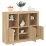 Decora el salón con estos modernos aparadores con luces LED, que combinan fácilmente con muebles de cualquier estilo. Material duradero: La madera de ingeniería tiene una calidad excepcional, con una superficie lisa y también cuenta con fuerza, estabilidad y resistencia a la humedad.Amplio espacio de almacenaje: Estos aparadores ofrecen un amplio espacio de almacenaje para mantener tus revistas, libros, mandos a distancia y otros objetos pequeños bien organizados y al alcance de la mano.Función expositora: La robusta parte superior de los armarios aparadores es ideal para exponer objetos decorativos, marcos de fotos o plantas en macetas.Luces LED ajustables: Estos armarios de almacenaje están equipados con luces LED RGB, que tienen diferentes menús para cambiar el color de la luz y ajustarlo automáticamente, lo que decora tu hogar colorido y hermoso. Advertencia:Para evitar que vuelque, este producto debe usarse con el dispositivo de fijación a la pared incluido.Información útil:El producto tiene un conector USB que necesita una fuente de alimentación USB certificada de 5 V (no incluida).