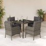 Este juego de comedor de jardín es una gran elección para comer al aire libre o simplemente para relajarte en el jardín, el patio o la terraza. Material duradero: El ratán de PE, también conocido como ratán sintético, es un material sintético resistente y de bajo mantenimiento que se parece al ratán natural. Es ligero, fácil de limpiar y se usa comúnmente para muebles de exterior debido a su durabilidad y propiedades resistentes a la intemperie.Experiencia de asiento cómoda: Estos muebles de exterior, completos con cojines acolchados gruesos, ofrecen una experiencia de asiento cómoda.Funda extraíble y lavable: Estos cojines para sillas cuentan con fundas extraíbles para facilitar su lavado y mantenimiento. Las fundas de los cojines de silla tienen una solapa en la parte posterior para facilitar su fijación a las sillas.Superficie de vidrio: La superficie de la mesa de exterior es de vidrio templado resistente y duradero, por lo que es fácil de limpiar con un paño húmedo y añade un toque de elegancia a tu espacio exterior.Estructura robusta y estable: La estructura de acero con recubrimiento en polvo garantiza que el mueble de jardín sea resistente y estable para usarlo a diario al aire libre. Información útil:Para asegurarte de que tus muebles de exterior se mantengan hermosos, recomendamos protegerlos con una funda impermeable.