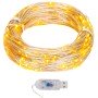 Esta cadena LED es perfecta para usar como complemento de iluminación en cualquier proyecto decorativo. Es adecuado para Navidad, fiestas, bodas y otras fiestas. La cadena tiene 300 LEDs, creando un rendimiento de iluminación de color azul. Tiene 8 efectos de iluminación diferentes: Modo de combinación, ondas, modo secuencial, modo de brillo lento, parpadeo, modo de decoloración lenta, giro e iluminación continua. Gracias al control remoto (pilas no incluidas. Use batería de botón CR2025) incluido, puedes usar la luz fácilmente. La cadena de luces con alambre de cobre se puede doblar fácilmente en cualquier forma que quieras. Es un gran complemento decorativo para iluminar espacios de interior y exterior, como jardines, vallas, portones, árboles de navidad, etc. Nota: El producto tiene un conector USB, pero la fuente de alimentación USB de 5V certificada no está incluida.