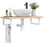 El estante de lavabo montado en la pared se fija de forma segura a la pared, proporcionando una solución elegante y que ahorra espacio para tu baño. Robusto y duradero: Este estante de lavabo se combina con una estructura de acero y una superficie de madera maciza de roble, lo que lo hace resistente, estable y duradero. Ahorro de espacio: El estante de lavabo flotante tiene un amplio espacio para almacenar cremas y artículos pequeños. Gracias a la forma rectangular, puedes colgar toallas u otras cosas en el soporte para ahorrar espacio. Fácil de usar: La encimera viene sin perforar para permitir que el lavabo se monte a la izquierda, a la derecha o en el centro, según los requisitos de la habitación. Gracias a los orificios pretaladrados en el soporte, se puede montar fácilmente con el tablero y montar en la pared. Diversos usos: Gracias a su diseño moderno, proporciona espacio adicional para varios tipos de baños. Información útil:Los tornillos no están incluidos, puedes comprar los tornillos por separado según la información que se proporciona a continuación. Fijación a la pared: 2 tornillos de expansión M8 por soporte Tabla de madera: 2 tornillos M5x18 (T=2) o 2 tornillos M5x20 (T=2,5/4cm) por soporte
