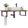 El estante de lavabo montado en la pared se fija de forma segura a la pared, proporcionando una solución elegante y que ahorra espacio para tu baño. Robusto y duradero: Este estante de lavabo se combina con una estructura de acero y una superficie de madera maciza de roble, lo que lo hace resistente, estable y duradero. Ahorro de espacio: El estante de lavabo flotante tiene un amplio espacio para almacenar cremas y artículos pequeños. Gracias a la forma trapezoidal, puedes colgar toallas u otras cosas en el soporte para ahorrar espacio. Fácil de usar: La encimera viene sin perforar para permitir que el lavabo se monte a la izquierda, a la derecha o en el centro, según los requisitos de la habitación. Gracias a los orificios pretaladrados en el soporte, se puede montar fácilmente con el tablero y montar en la pared. Diversos usos: Gracias a su diseño moderno, proporciona espacio adicional para varios tipos de baños. Información útil:Los tornillos no están incluidos, puedes comprar los tornillos por separado según la información que se proporciona a continuación. Fijación a la pared: 2 tornillos de expansión M8 por soporte Tabla de madera: 2 tornillos M5x18 (T=2) o 2 tornillos M5x20 (T=2,5/4cm) por soporte