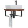 El estante de lavabo montado en la pared se fija de forma segura a la pared, proporcionando una solución elegante y que ahorra espacio para tu baño. Robusto y duradero: Este estante de lavabo se combina con una estructura de acero y una superficie de madera maciza de roble, lo que lo hace resistente, estable y duradero. Ahorro de espacio: El estante de lavabo flotante tiene un amplio espacio para almacenar cremas y artículos pequeños. Gracias a la forma trapezoidal, puedes colgar toallas u otras cosas en el soporte para ahorrar espacio. Fácil de usar: La encimera viene sin perforar para permitir que el lavabo se monte a la izquierda, a la derecha o en el centro, según los requisitos de la habitación. Gracias a los orificios pretaladrados en el soporte, se puede montar fácilmente con el tablero y montar en la pared. Diversos usos: Gracias a su diseño moderno, proporciona espacio adicional para varios tipos de baños. Información útil:Los tornillos no están incluidos, puedes comprar los tornillos por separado según la información que se proporciona a continuación. Fijación a la pared: 2 tornillos de expansión M8 por soporte Tabla de madera: 2 tornillos M5x18 (T=2) o 2 tornillos M5x20 (T=2,5/4cm) por soporte