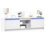 Con un diseño moderno y práctico, este mueble para la TV con luces LED definitivamente se conviertirá en el centro de atención de tu habitación. Material estable y duradero: La madera de ingeniería es un material duradero y estable con una superficie lisa que es resistente a la humedad, la deformación y la rotura, lo que la convierte en una opción fiable para una variedad de proyectos.Luces LED RGB para un ambiente agradable: Este soporte de TV cuenta con luces LED que se pueden ajustar fácilmente para crear un espectáculo de luces personalizado. Puedes personalizar los modos, los colores y el brillo para mejorar el ambiente de tu hogar.Amplio espacio de almacenamiento: Este mueble de TV proporciona un amplio espacio de almacenamiento para mantener tus revistas, libros, DVD y dispositivos multimedia bien organizados y al alcance de la mano.Superficie estable y resistente: La robusta superficie es ideal para colocar el televisor y el equipo de música o algunos objetos decorativos como jarrones o macetas. Información útil:El producto tiene un conector USB que necesita una fuente de alimentación USB certificada de 5 V (no incluida). Advertencia:Para evitar que vuelque, este producto debe usarse con el dispositivo de fijación a la pared suministrado.